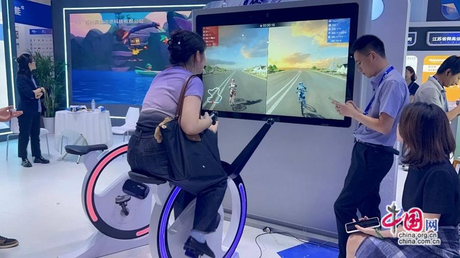 圖為參觀者在第四屆全球數(shù)字貿(mào)易博覽會(huì)上體驗(yàn)智能自行車。中國(guó)網(wǎng)徐林 攝