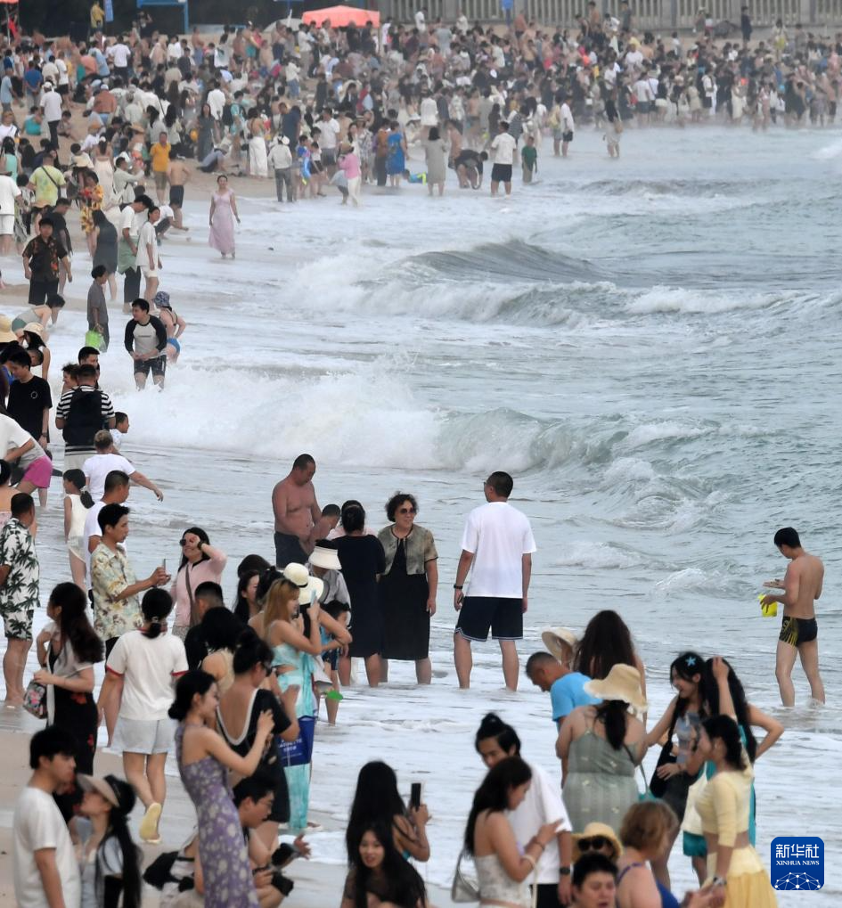 10月6日,在海南省三亞市大東海景區(qū),市民和游客在海灘戲水。