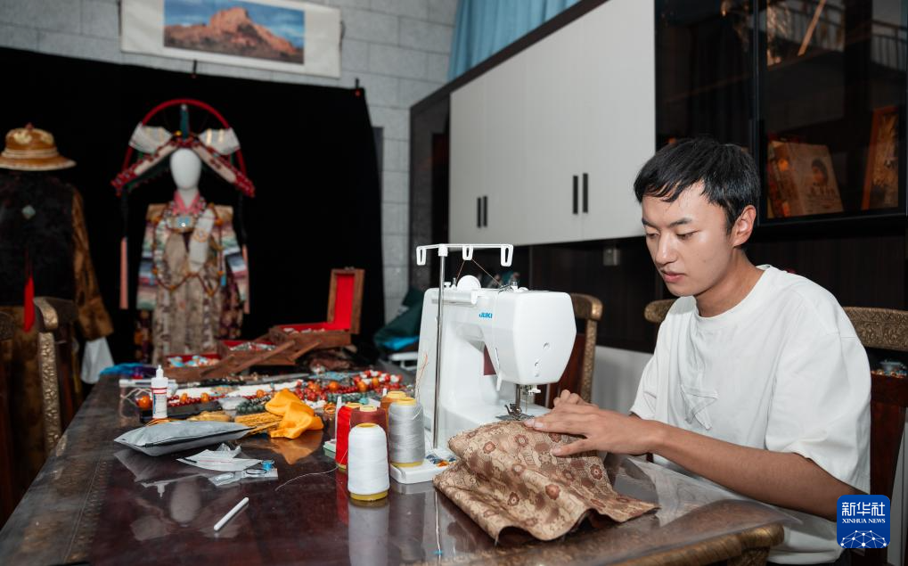 班珠丹塔在家中工作室內(nèi)縫制藏裝(9月11日攝)。