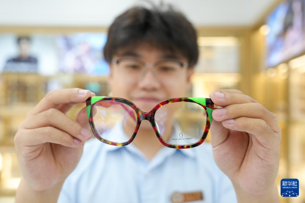 在中國(guó)丹陽(yáng)國(guó)際眼鏡城內(nèi),工作人員展示眼鏡鏡架(9月25日攝)。
