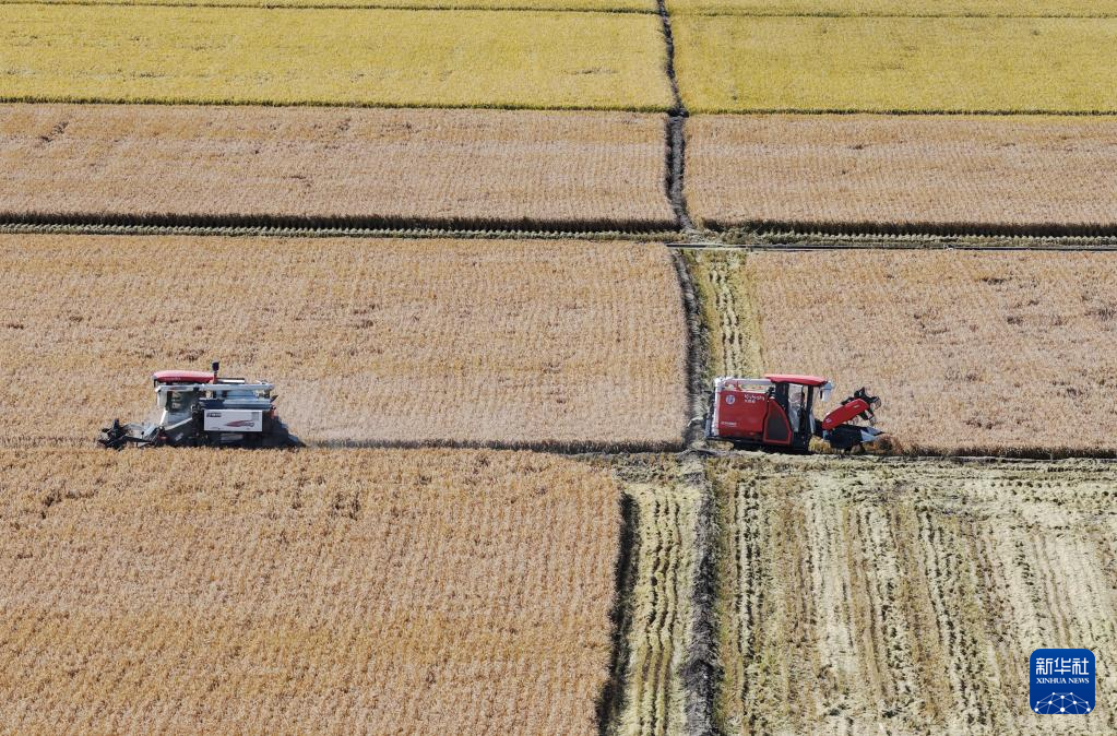 在位于黑龍江省雙鴨山市的北大荒集團(tuán)友誼農(nóng)場有限公司,機(jī)械設(shè)備在進(jìn)行水稻收獲作業(yè)(9月23日攝)。