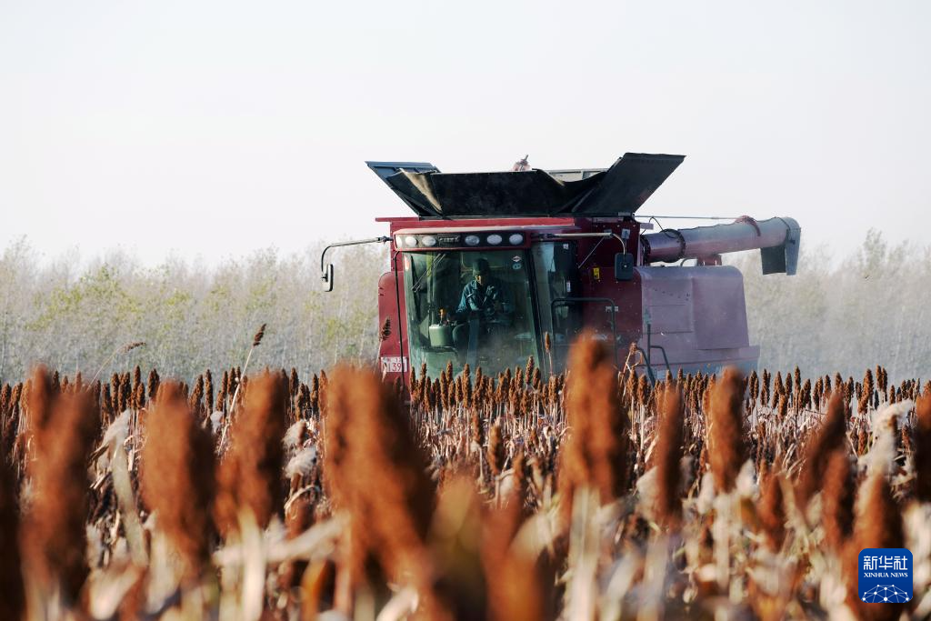 10月11日,在位于黑龍江省肇東市的北大荒集團(tuán)四方山農(nóng)場有限公司,機(jī)械設(shè)備在進(jìn)行高粱收獲作業(yè)。