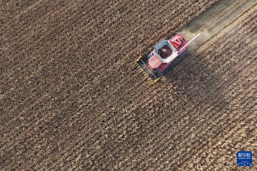 10月11日,在位于黑龍江省肇東市的北大荒集團(tuán)四方山農(nóng)場有限公司,機(jī)械設(shè)備在進(jìn)行玉米收獲作業(yè)(無人機(jī)照片)。