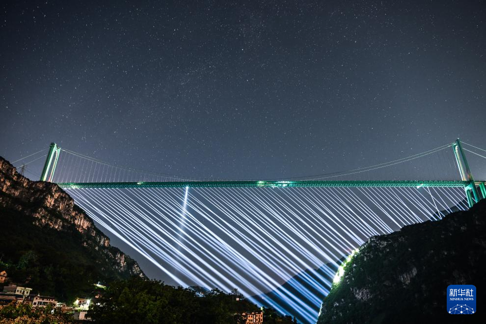 夜晚,新的世界第一高橋——貴州花江峽谷大橋呈現(xiàn)出不同光影美景,吸引游客前來觀賞。