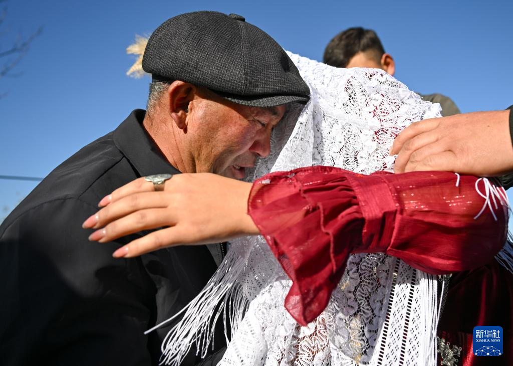 迎親隊(duì)伍即將離開冬牧場(chǎng),前往新郎家,孔吐斯·也斯達(dá)吾列提和父親擁抱話別(10月11日攝)。