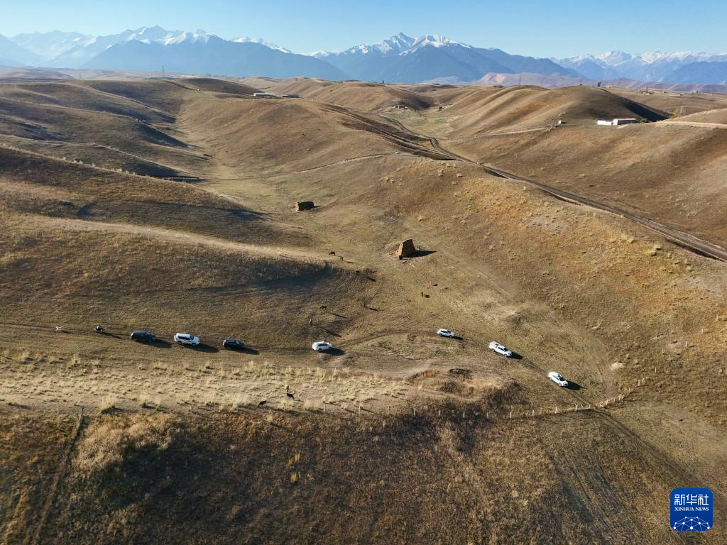 迎親車隊(duì)離開冬季牧場(chǎng),前往新郎家(10月11日攝,無(wú)人機(jī)照片)。