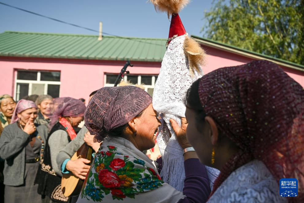 在特克斯縣喀拉達(dá)拉鎮(zhèn)加爾闊拉村,阿肯彈奏冬不拉,向新娘介紹男方親友(10月11日攝)。