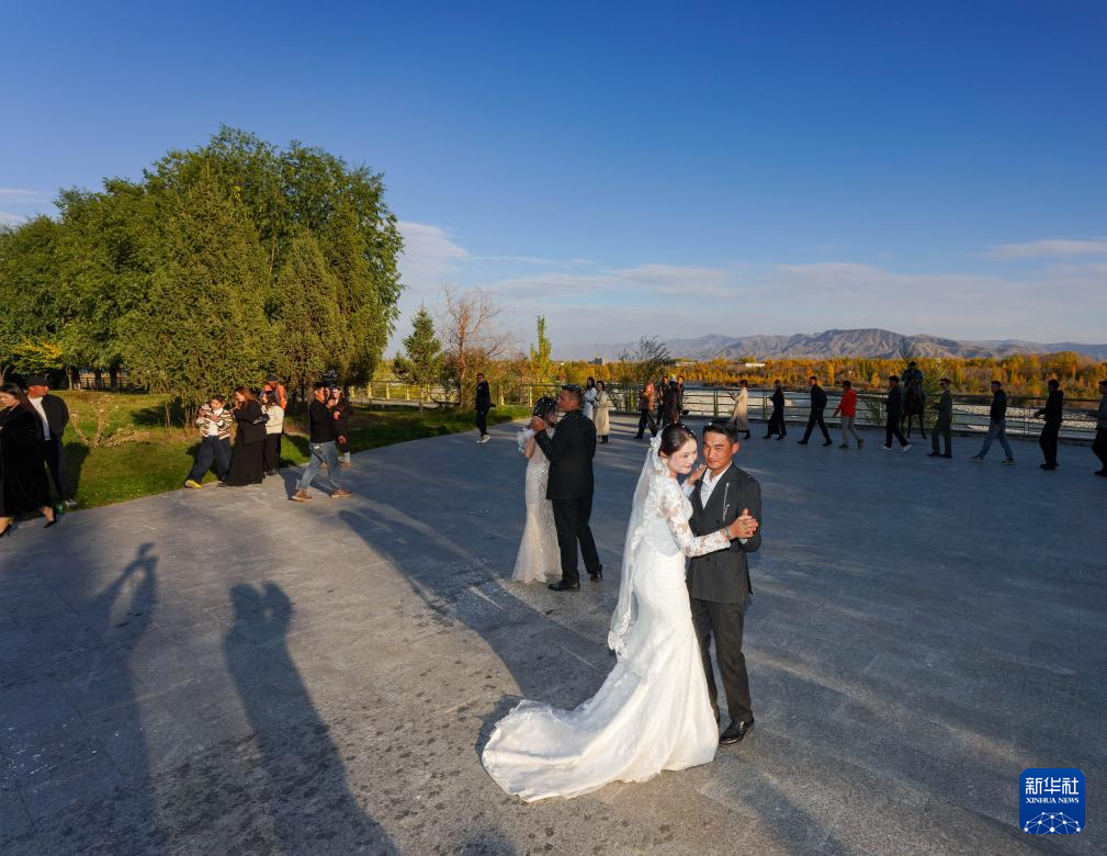 在特克斯河邊的太極島森林公園,新娘孔吐斯·也斯達(dá)吾列提與新郎布開汗·葉勒斯孜挽手走在一起(10月11日攝)。
