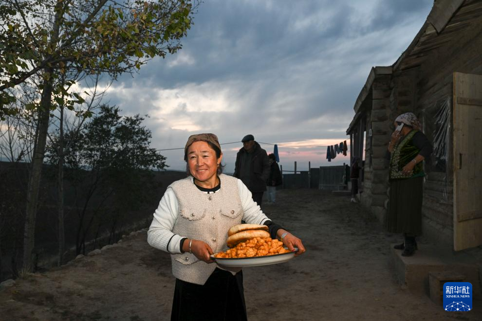 出嫁前一晚,孔吐斯·也斯達(dá)吾列提的母親端著馕和包爾薩克走在家中小院,準(zhǔn)備招待男方親戚(10月10日攝)。