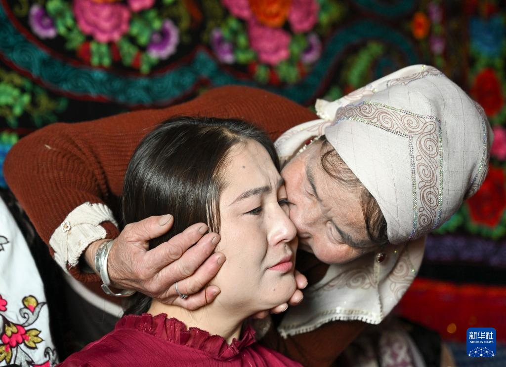 三伯母(右)親吻孔吐斯·也斯達(dá)吾列提,送她出嫁(10月11日攝)。
