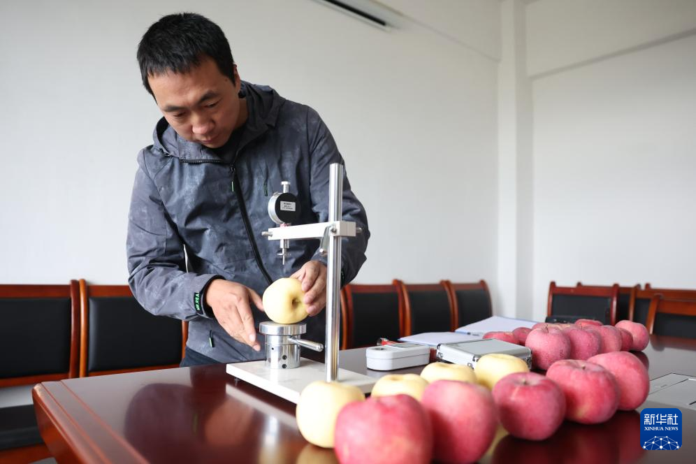 禮縣蘋果研究所工作人員在檢測(cè)蘋果硬度(10月14日攝)。