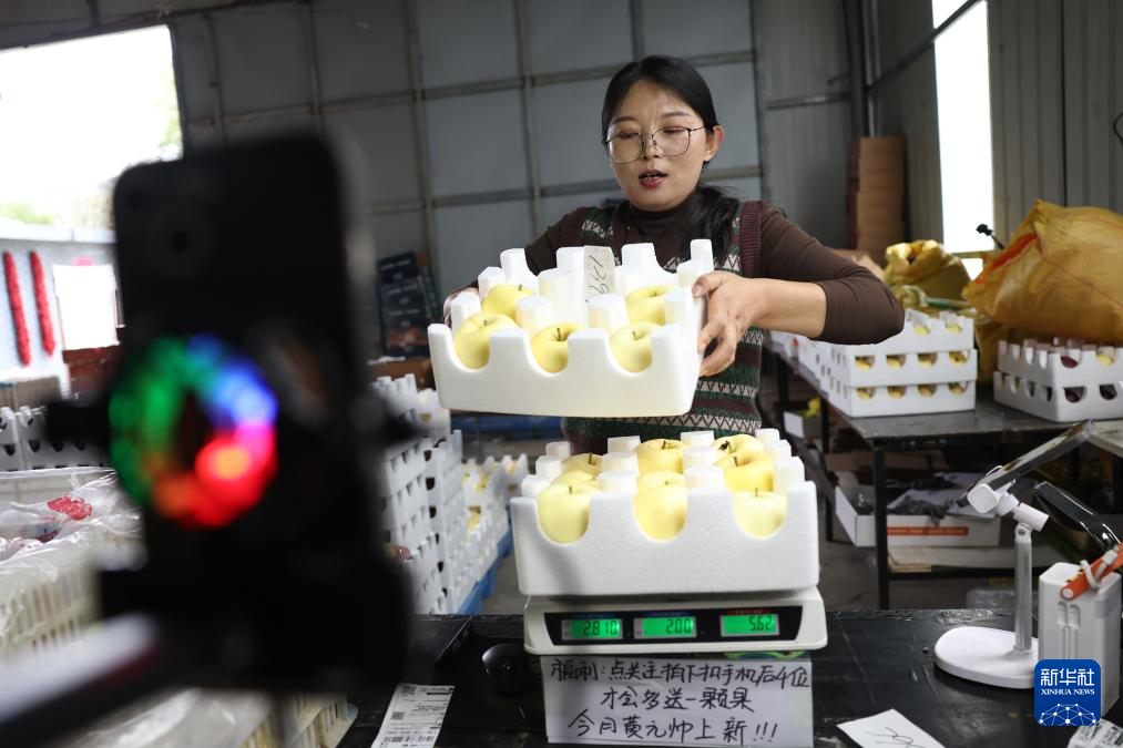 新農(nóng)人李大方在自己的電商創(chuàng)業(yè)基地通過網(wǎng)絡(luò)平臺直播帶貨銷售禮縣蘋果(10月14日攝)。