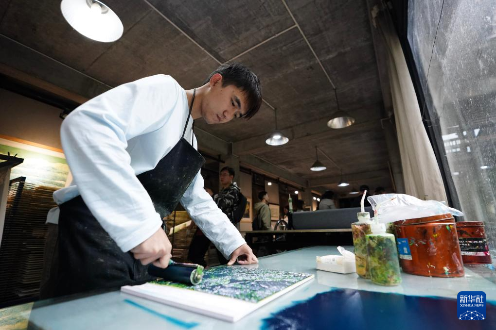 10月22日,在云南普洱學(xué)院那柯里絕版木刻教學(xué)實踐基地,普洱學(xué)院藝術(shù)學(xué)院學(xué)生在上色。