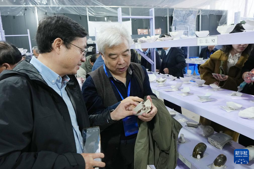 考古學(xué)家們?cè)谔K峪口瓷窯址考古隊(duì)文物庫(kù)房?jī)?nèi)對(duì)出土瓷器進(jìn)行考察(10月13日攝)。