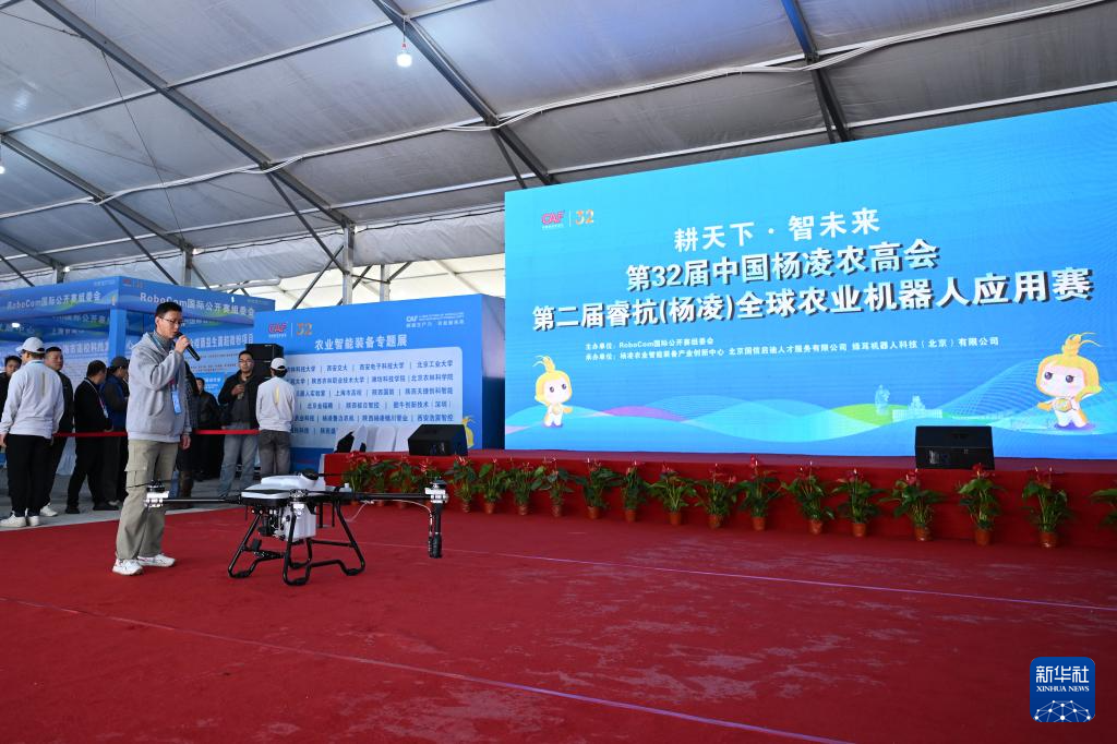 10月26日,在第32屆楊凌農高會的農業(yè)機器人比賽上,陜西國防工業(yè)技師學院的選手介紹參賽的農用無人機。