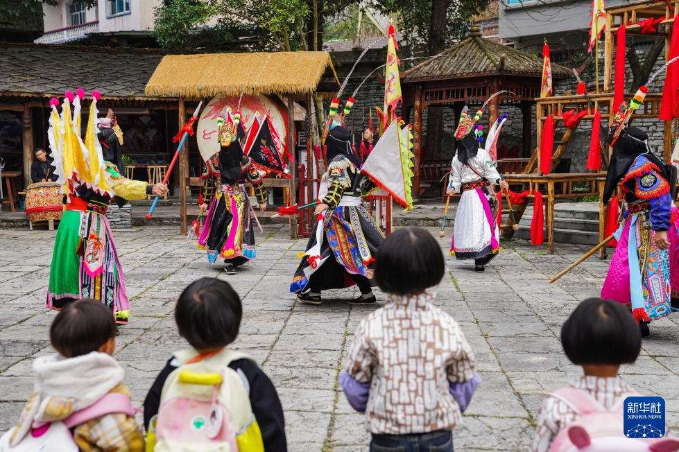 10月24日,孩子們在貴州安順天龍屯堡古鎮(zhèn)觀看地戲表演。