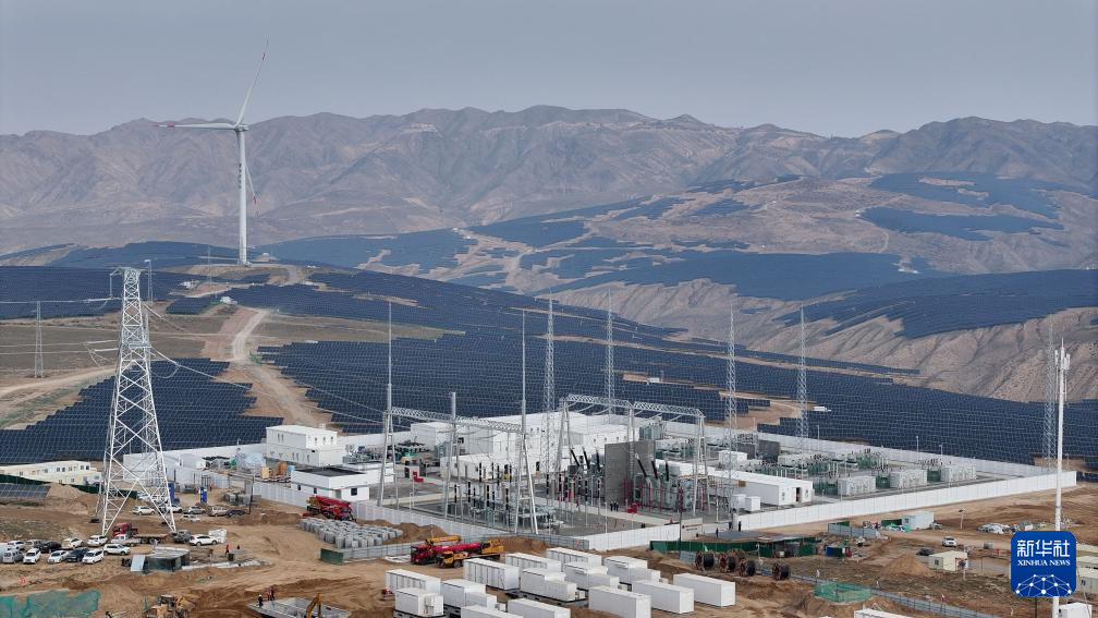10月25日拍攝的中衛(wèi)300萬(wàn)千瓦光伏綠電項(xiàng)目1號(hào)升壓站(無(wú)人機(jī)照片)。