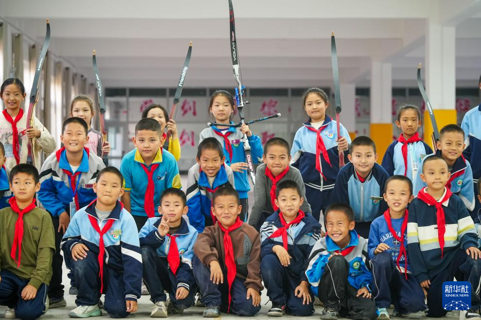在新疆伊寧市第二十五小學,吳俊亮組織的射箭社團在訓練后合影(10月23日攝)。