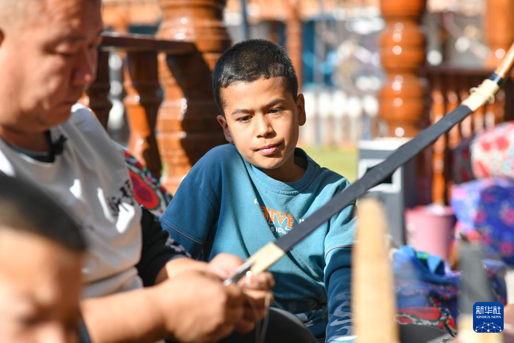 吳俊亮在射箭館維修傳統(tǒng)弓,吸引周邊的小朋友前來(lái)圍觀(10月25日攝)。
