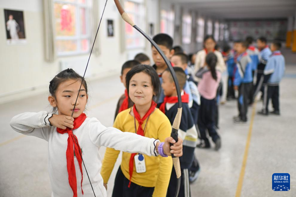 新疆伊寧市第二十五小學(xué)射箭社團的學(xué)生排隊體驗傳統(tǒng)弓(10月23日攝)。