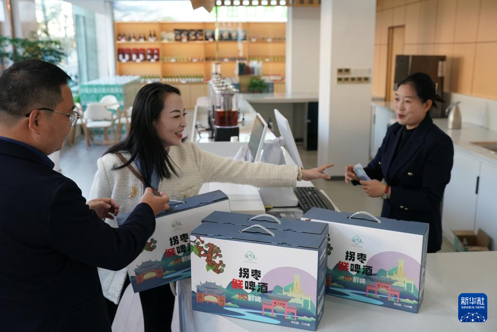 10月27日,消費(fèi)者在旬陽市一家拐棗產(chǎn)品銷售店購買拐棗啤酒。
