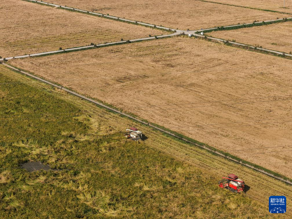 10月29日,收割機(jī)在東林鎮(zhèn)保國村的水稻田里收割稻谷(無人機(jī)照片)。