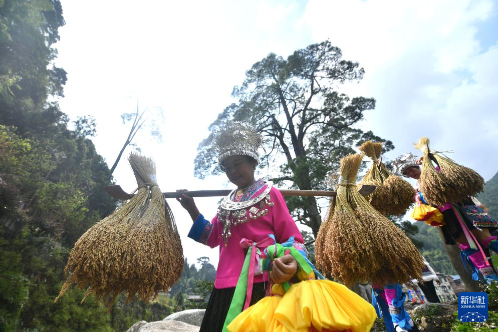 在廣西柳州市融水苗族自治縣安太鄉(xiāng)培秀村,村民們在樹下向游客展示稻魚文化(2025年10月18日攝)。
