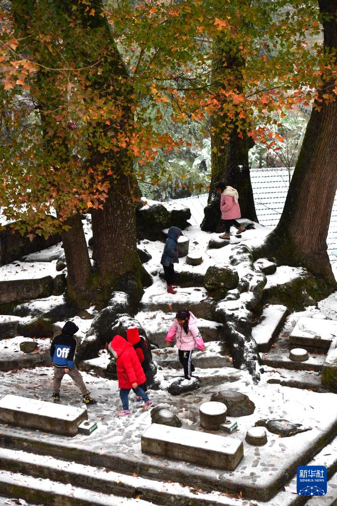 在廣西柳州市融水苗族自治縣桿洞鄉(xiāng)烏英苗寨,孩子們在樹下玩雪(2021年12月26日攝)。