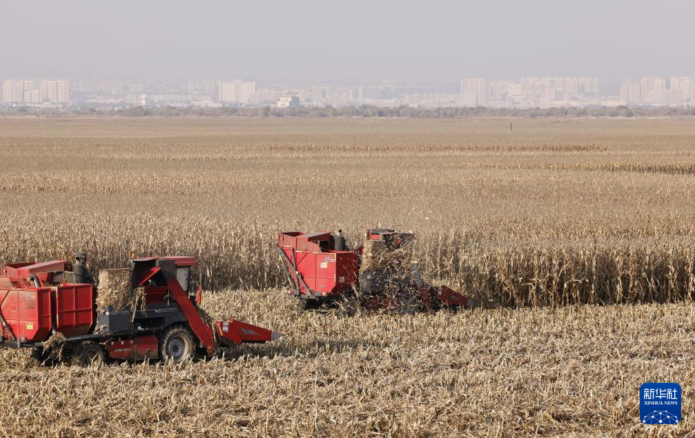 10月28日,農(nóng)民駕駛收割機(jī)在內(nèi)蒙古鄂爾多斯市達(dá)拉特旗收獲玉米。