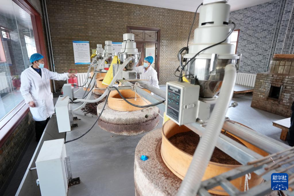 隆德縣鳳嶺鄉(xiāng)李士村村民在非遺工坊用石磨榨油(10月26日攝)。