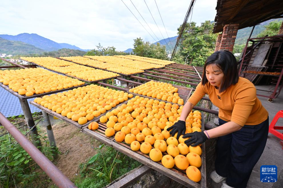 金秋送爽,福建福州市永泰縣梧桐鎮(zhèn)迎來了繁忙的柿餅加工時節(jié),人們趁晴好天氣,將削皮后的柿子擺在房前屋后晾曬,金燦燦的柿子與村落、青山相映,勾勒出秋日好“豐”景。晾曬好的柿餅圓潤飽滿,入口軟糯,是當地傳統特色美食。