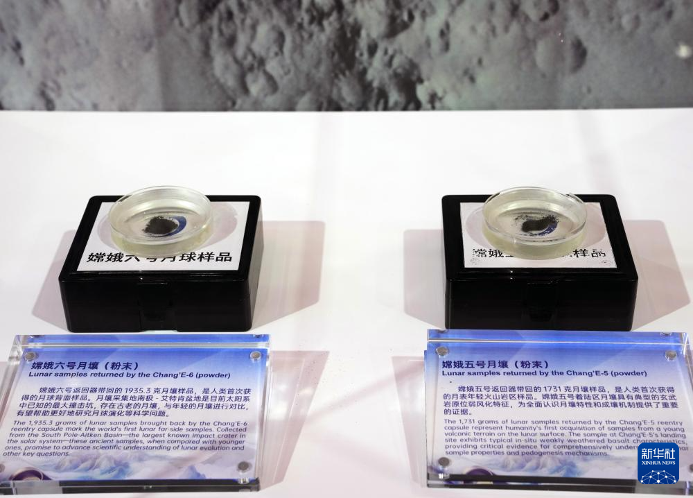 這是11月5日在第八屆進(jìn)博會(huì)國(guó)家展中國(guó)館拍攝的嫦娥五號(hào)月壤和嫦娥六號(hào)月壤。