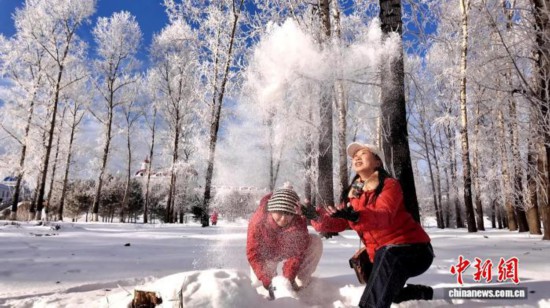 游客在呼瑪一邊欣賞霧凇一邊玩雪。 王婷 攝