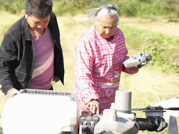 戴淑英(左)在王甜甜的指導(dǎo)下操作植保無(wú)人機(jī)。