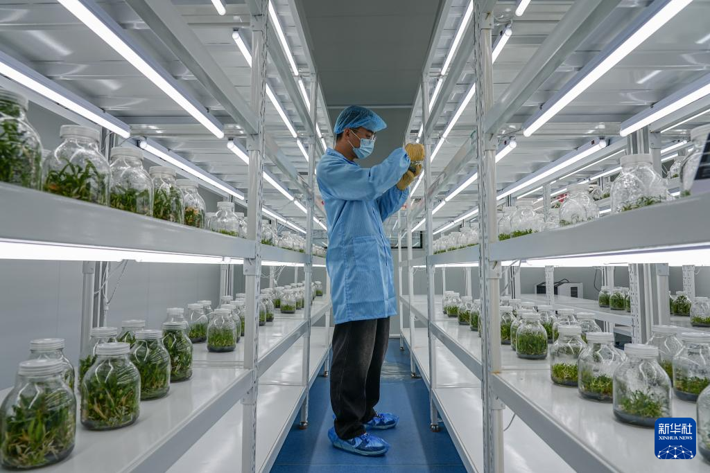11月7日,農(nóng)技人員在雙泉莊村中草藥脫毒組培苗繁育實驗室內(nèi)觀察石斛秧苗。