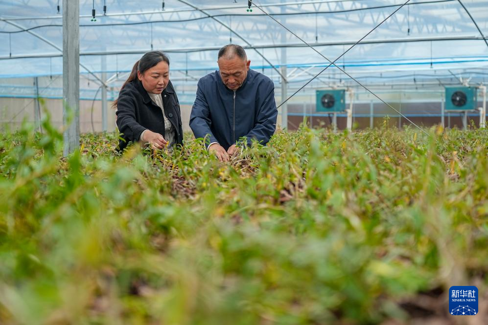 11月7日,雙泉莊村黨支部書(shū)記王慶柱(右)在查看石斛生長(zhǎng)情況。