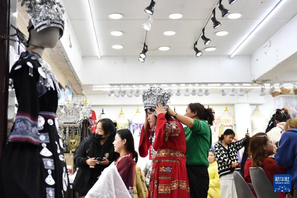 11月6日,游客在鳳凰古城一家旅拍店內(nèi)準(zhǔn)備著裝。