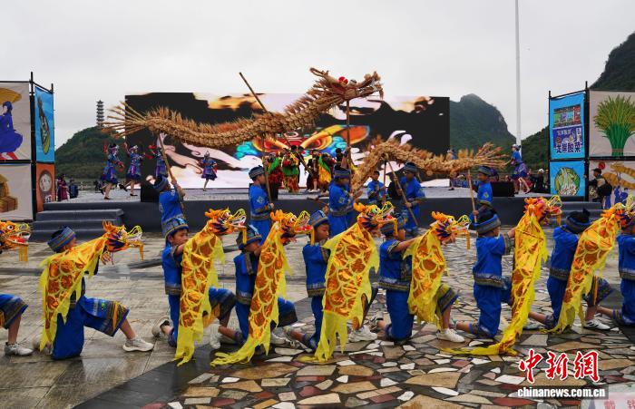 11月8日,中國唯一的仫佬族自治縣——廣西河池市羅城仫佬族自治縣舉辦傳統(tǒng)節(jié)日依飯節(jié),當(dāng)?shù)孛癖娚碇褡宸?,載歌載舞,展示仫佬族民俗風(fēng)情。依飯節(jié)有500余年歷史,是仫佬族民眾感恩還愿、慶祝豐收的傳統(tǒng)節(jié)日。圖為仫佬族舞草龍表演。中新社記者 黃艷梅 攝