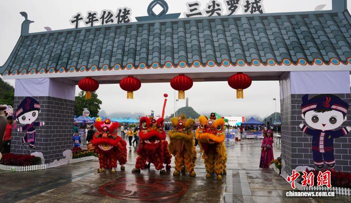 11月8日,中國唯一的仫佬族自治縣——廣西河池市羅城仫佬族自治縣舉辦傳統(tǒng)節(jié)日依飯節(jié),當(dāng)?shù)孛癖娚碇褡宸棧d歌載舞,展示仫佬族民俗風(fēng)情。依飯節(jié)有500余年歷史,是仫佬族民眾感恩還愿、慶祝豐收的傳統(tǒng)節(jié)日。圖為舞獅表演。中新社記者 黃艷梅 攝