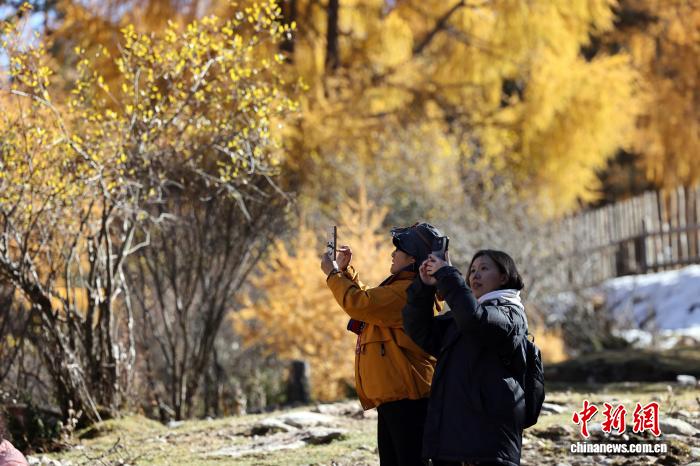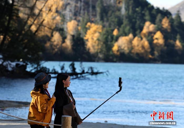 11月9日,位于四川省甘孜州康定市的木格措景區(qū),豐富的森林資源讓各種成熟的色彩交織在一起,構成了獨特的秋景,讓人流連忘返。圖為游客在木格措景區(qū)自拍留念。中新社記者 王磊 攝