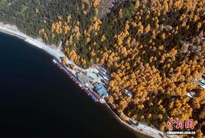 11月9日,位于四川省甘孜州康定市的木格措景區(qū),豐富的森林資源讓各種成熟的色彩交織在一起,構成了獨特的秋景,讓人流連忘返。(無人機照片)中新社記者 王磊 攝