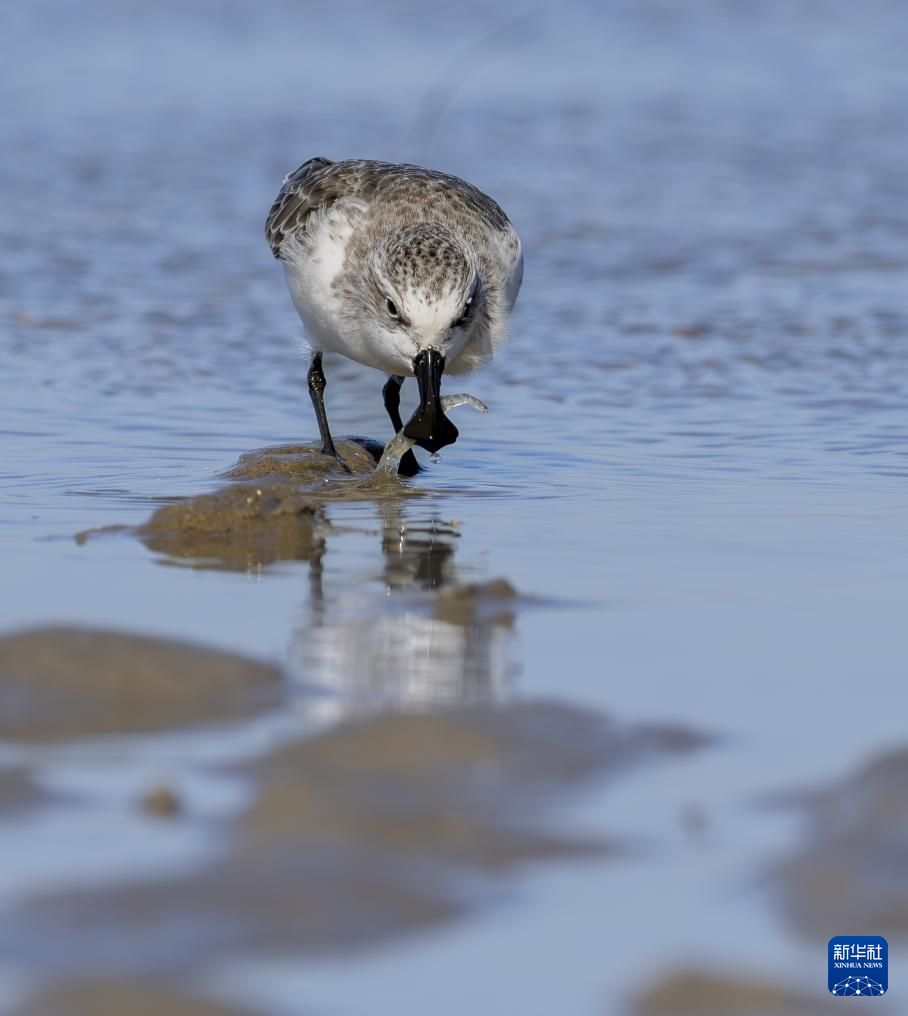 11月9日,一只勺嘴鷸在泉州圍頭灣灘涂上捕食海蝦。