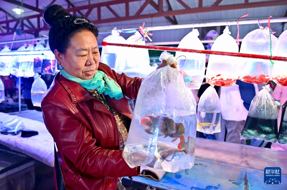 4月10日,在鞍山三臺(tái)子觀賞魚交易中心,一名商戶展示自家售賣的觀賞魚。