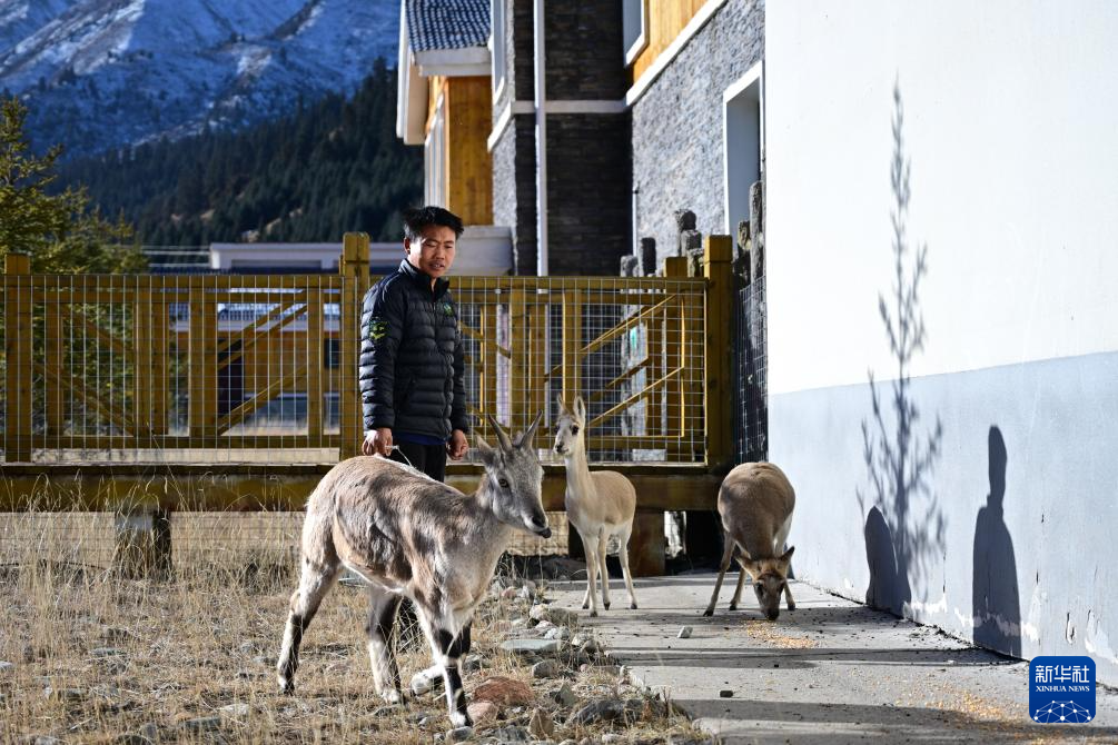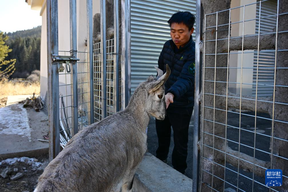 11月10日,在救護(hù)繁育站,工作人員劉林春和一只被救助的巖羊互動(dòng)。