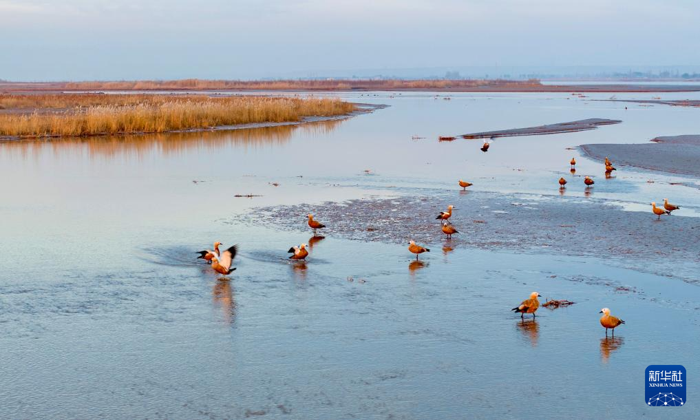11月11日,候鳥(niǎo)在寧夏平羅天河灣國(guó)家濕地公園棲息覓食(無(wú)人機(jī)照片)。