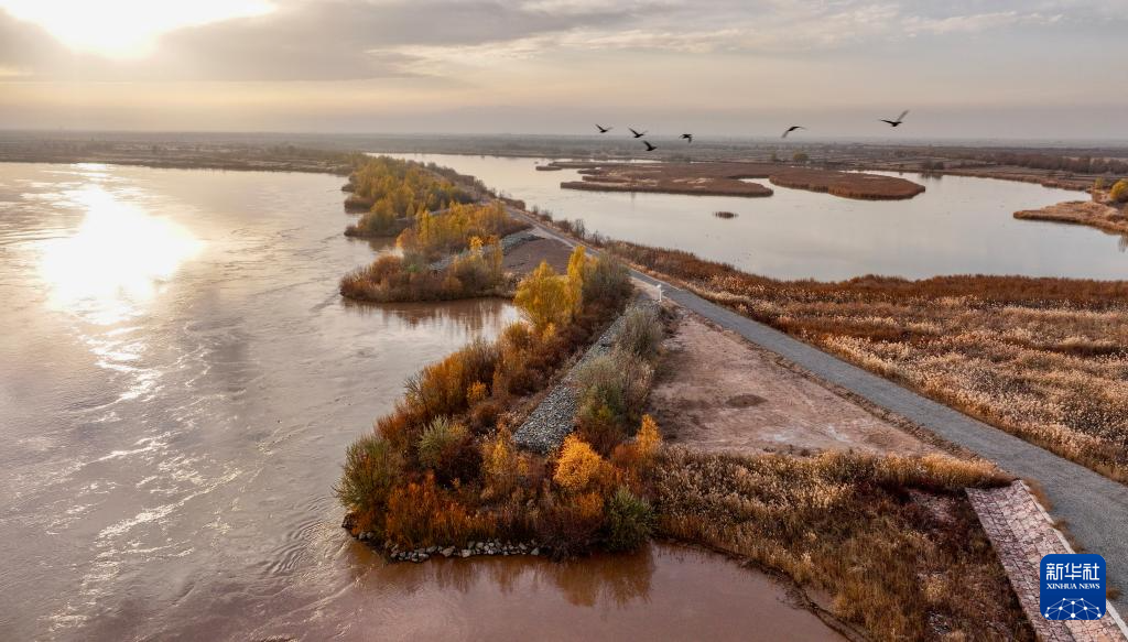 這是11月11日拍攝的寧夏平羅天河灣國(guó)家濕地公園(右)和黃河(無(wú)人機(jī)照片)。