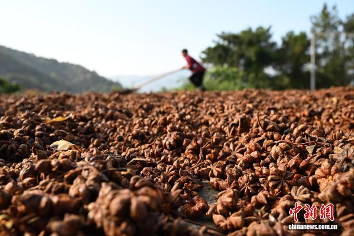 11月13日,在廣西田林縣的民創(chuàng)農(nóng)副產(chǎn)品經(jīng)營部,工人們在晾曬八角。黃數(shù)情 攝