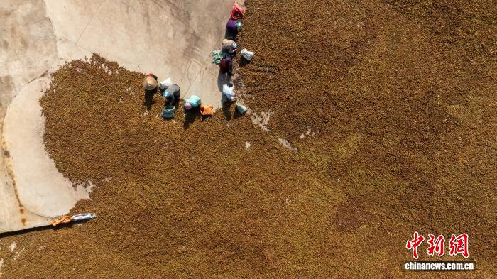 11月13日,在廣西田林縣的民創(chuàng)農(nóng)副產(chǎn)品經(jīng)營部,工人們在晾曬油茶果(無人機照片)。趙文朝 攝