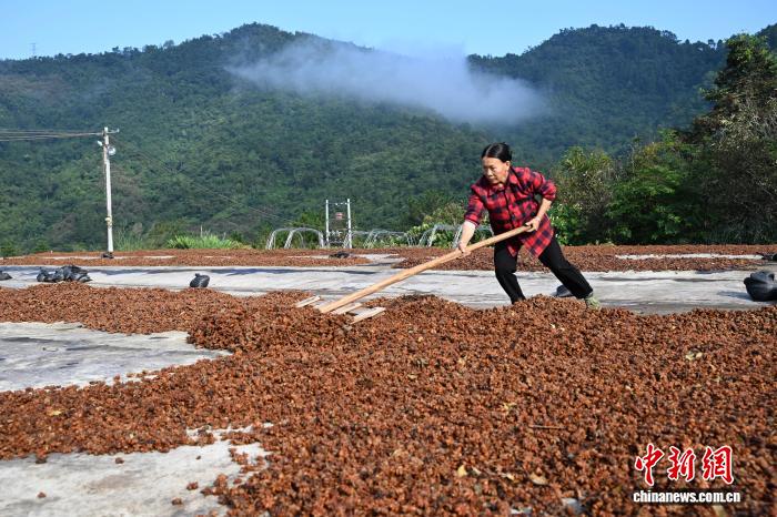 11月13日,在廣西田林縣的民創(chuàng)農(nóng)副產(chǎn)品經(jīng)營部,工人們在晾曬油茶果。黃數(shù)情 攝