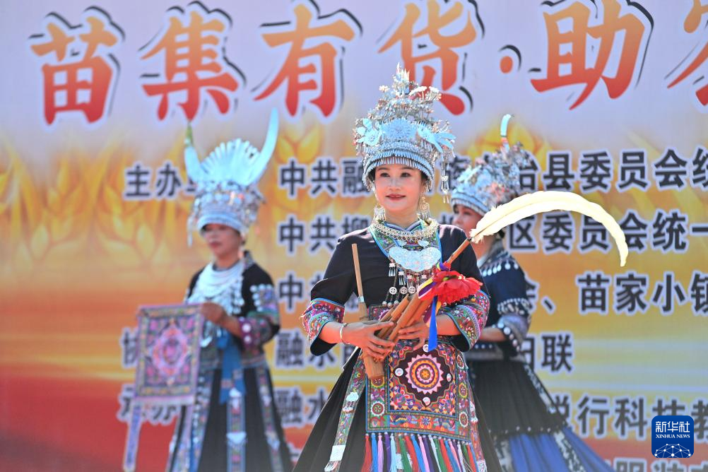 11月15日,在融水縣融水鎮(zhèn)苗家小鎮(zhèn)社區(qū),演員展示蘆笙和苗繡。